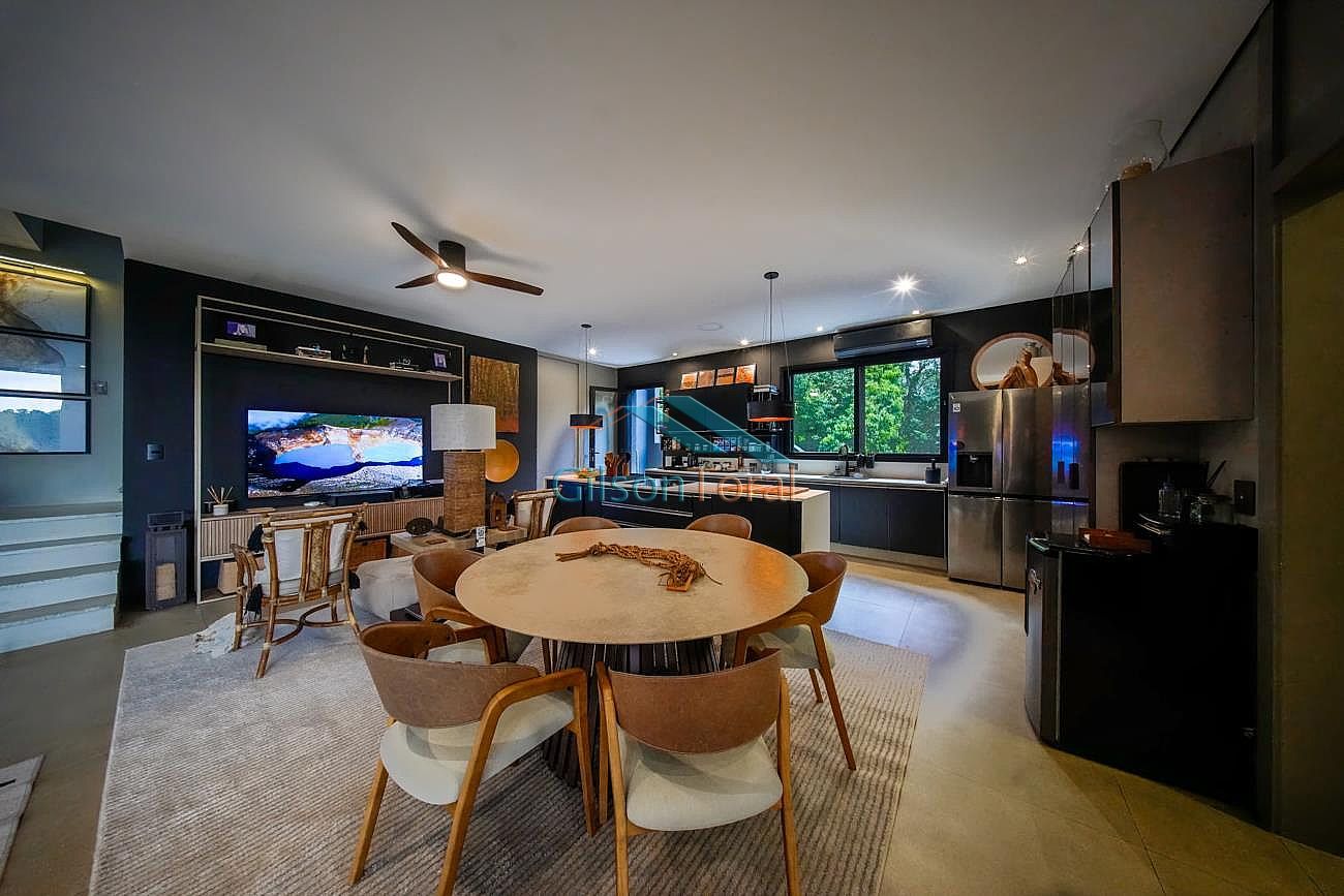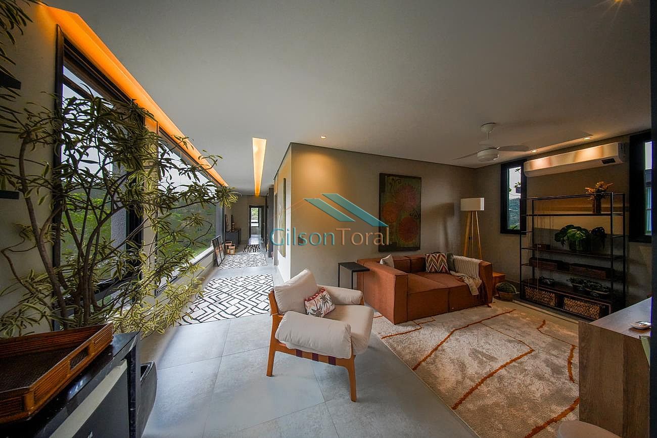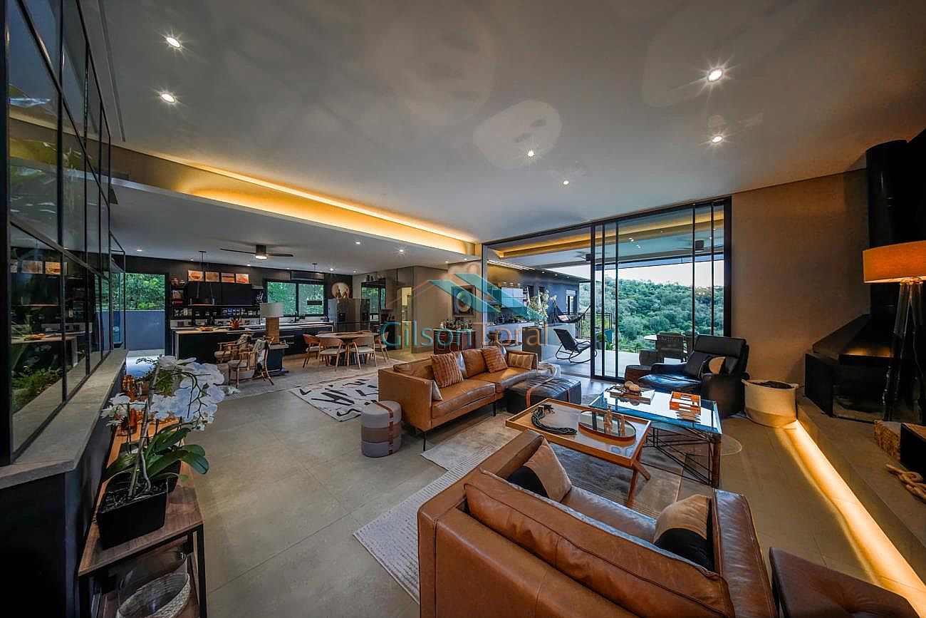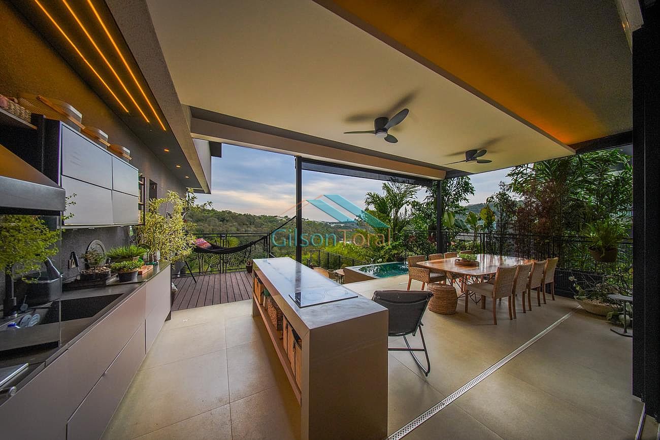Aconchegante Casa em Alphaville, contemporânea e integrada a natureza, com 480m² de construção em 546m² de terreno, ambientes integrados, 4 suítes sendo 1 no térreo, sala com lareira, lavabo com jardim de inverno, cozinha gourmet com vista para o verde e uma cozinha de apoio, SPA aquecido, área gourmet e piscina com vista definitiva para a mata, espaço multi uso amplo que pode ser uma academia, atelier, estúdio etc.