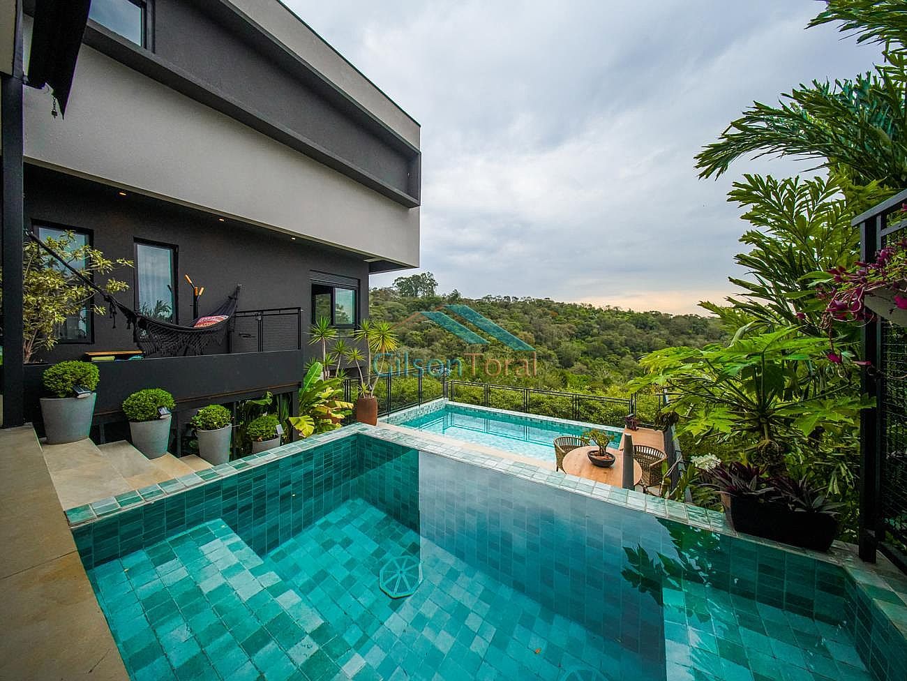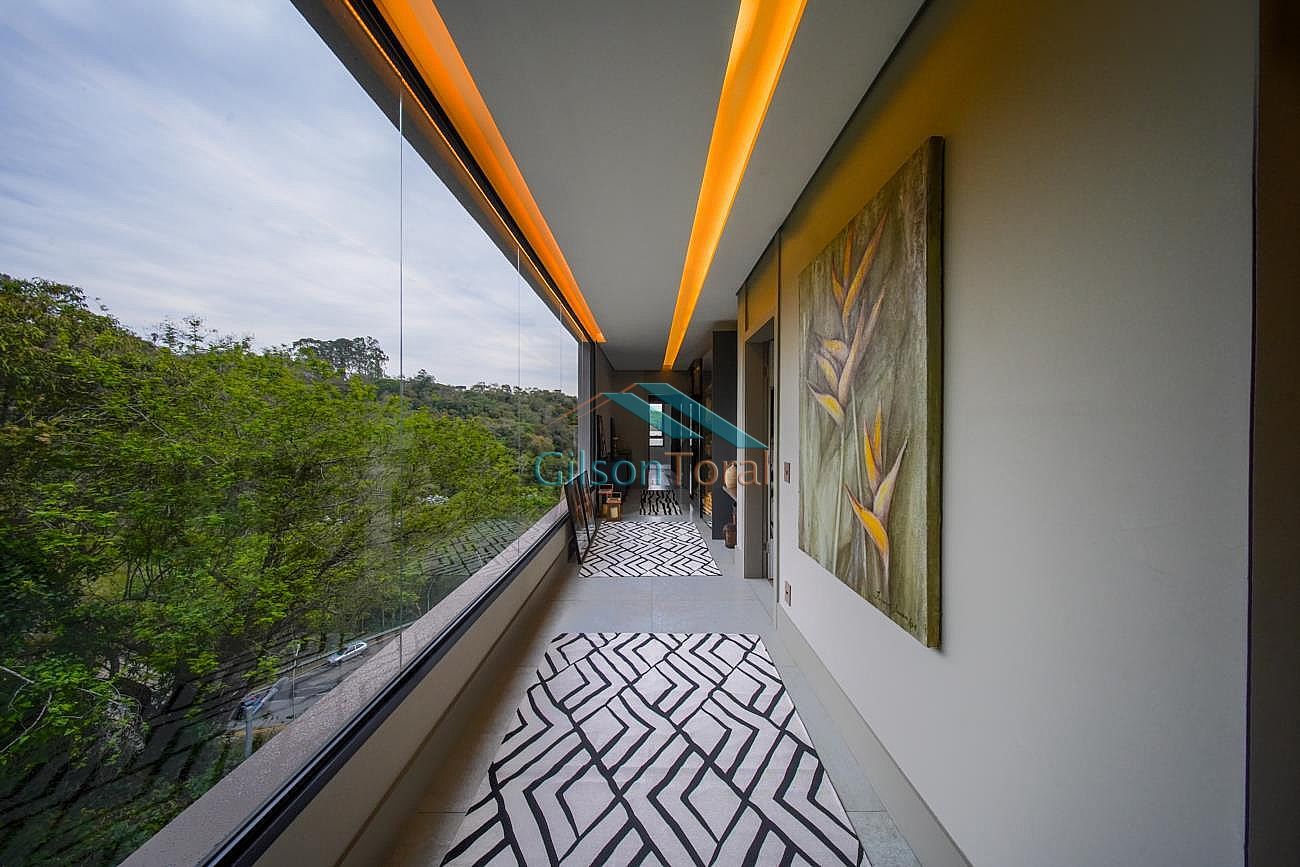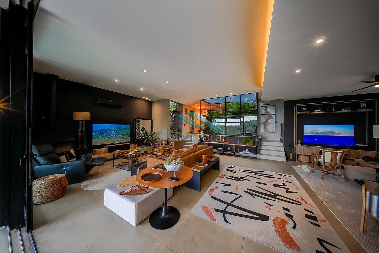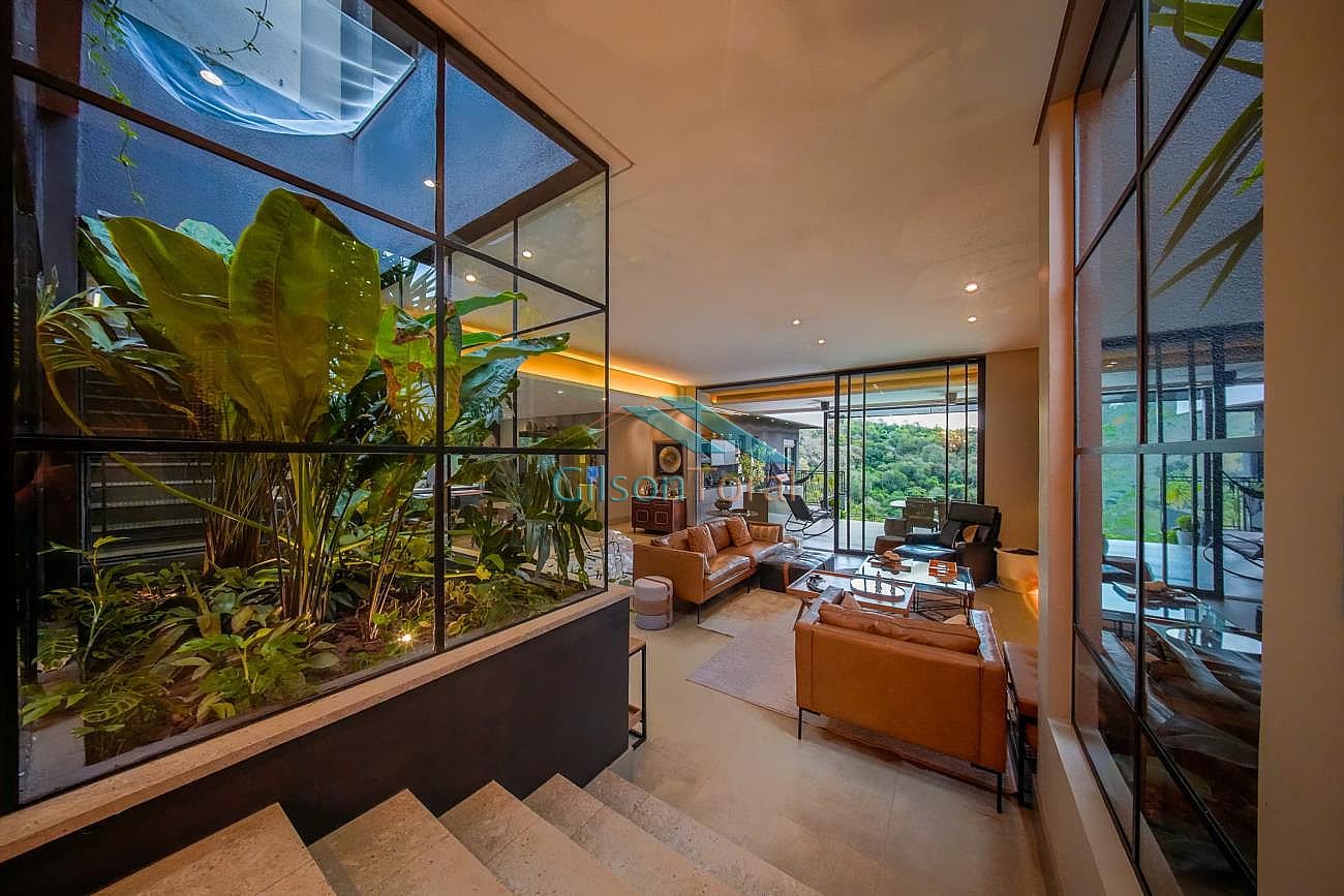 Aconchegante Casa em Alphaville, contemporânea e integrada a natureza, com 480m² de construção em 546m² de terreno, ambientes integrados, 4 suítes sendo 1 no térreo, sala com lareira, lavabo com jardim de inverno, cozinha gourmet com vista para o verde e uma cozinha de apoio, SPA aquecido, área gourmet e piscina com vista definitiva para a mata, espaço multi uso amplo que pode ser uma academia, atelier, estúdio etc.