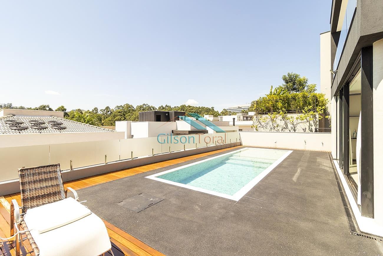 Casa Nova e Contemporânea em Tamboré, fino acabamento, ambientes amplos e integrados, 4 suítes sendo master com closet, 2 duchas e hidromassagem, copinha, espaço para roupeiro, sala de TV, amplo living e cozinha planejada e equipada integrados, despensa, escritório, área gourmet com churrasqueira, sauna, piscina com prainha aquecida, e uma linda vista permanente.